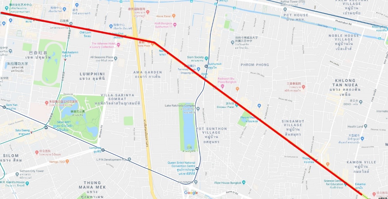 这一段是以BTS(轻轨)的National Stadium(国家体育场)站开始,依次是Siam(暹罗)、Chit Lom(奇隆)、Phloen Chit(奔奇)、Nana(娜娜)、Asoke(阿索克)、Phrom Phong(澎蓬)、Thong Lo(通罗),到Ekkamai(伊卡麦)为止。