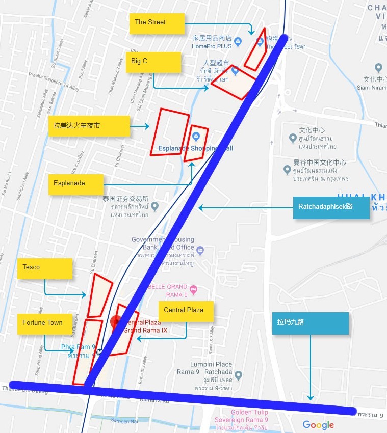 然后重点说说拉玛9(RAMA 9)地区。这一地区最近一段时间常常会听到,但我其实并不知道它的准确位置,实际上拉玛9路(Rama IX Rd)是一条基本平行素坤逸路,东西方向的路,但以我们实际居住的经验,这一地区最繁华的是一条垂直于拉玛9路的Ratchadaphisek路,它从BTS 的RAMA 9站到辉煌(Huai Khwang)站的这一段(一共三站,中间还有一站:泰国文化中心站),是拉玛9(RAMA 9)地区最繁华的地段。见图: