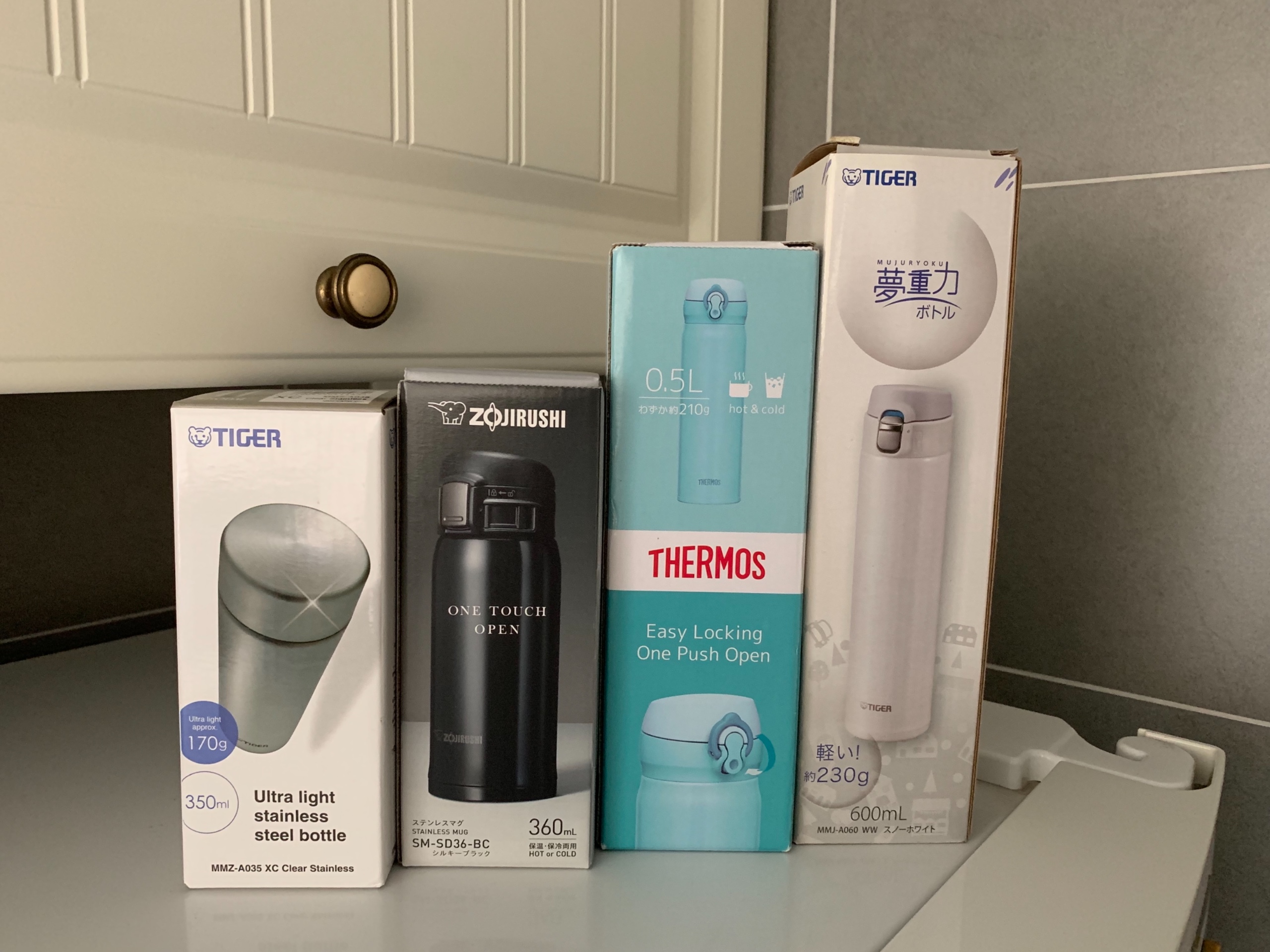 从左到右,容量分别是350、360、500、600毫升,颜色分别是不锈钢色、磨砂黑、天蓝色、白色,价格象印140,膳魔师和虎牌130。