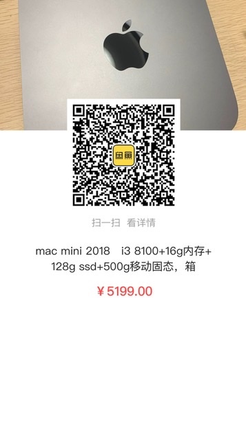 mac mini 2018   i3 8100+16g内存+128g ssd+500g移动固态,箱说配件全