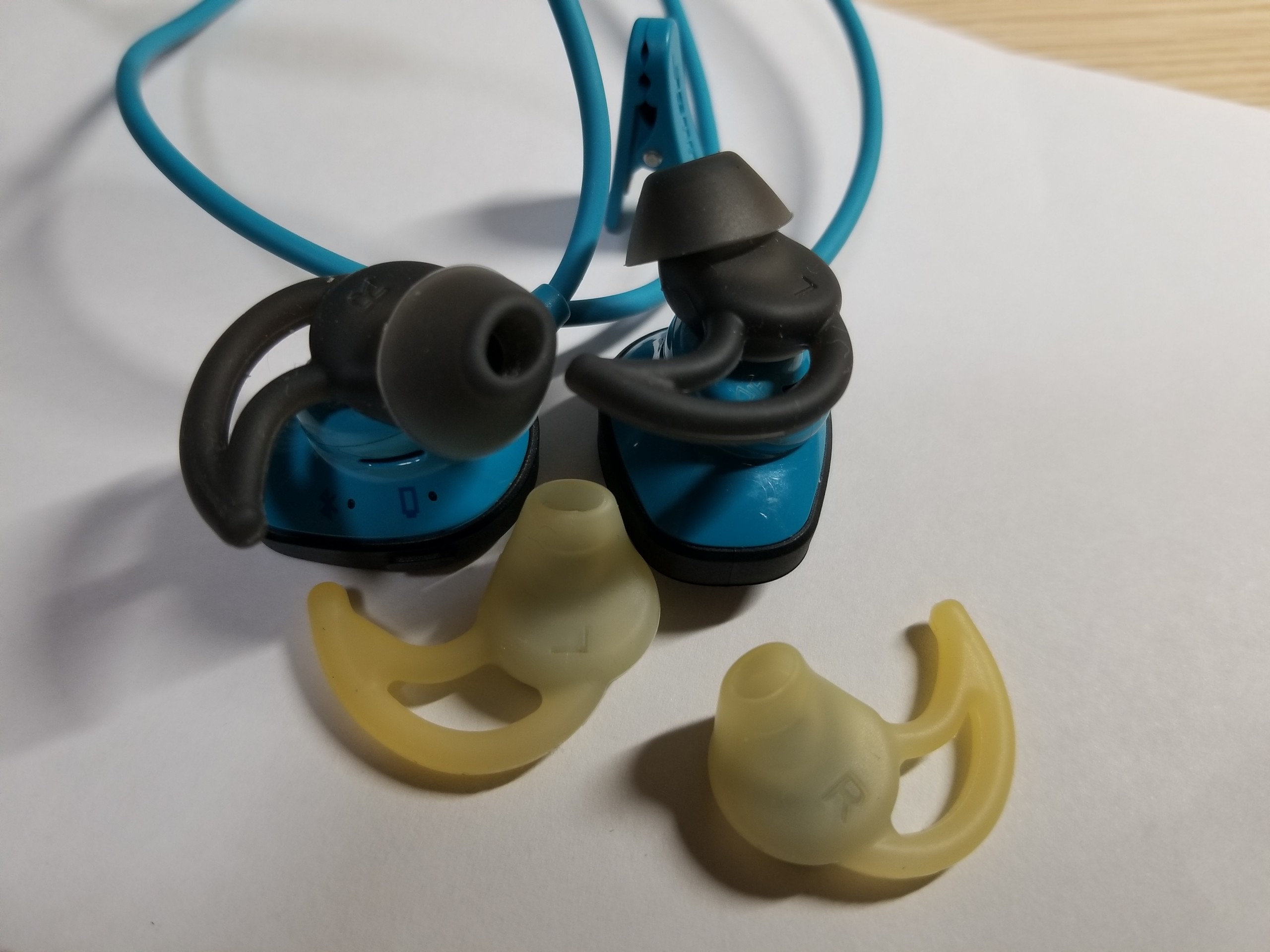 上月旅游,把耳机丢了,前几天在BS收了个蓝色bose soundsport wireless。买家说一手自用,橙色很新没,全套都在。到手后,橙色并没有描述的那么好。但看到有原装盒,也就罢了。再仔细一看,适合我的中号耳套没有了,我问卖家,卖家说中号耳套白色的,太脏了,发黄了,恶心人,就没发给我。我问他,为什么官网蓝色配灰黑的儿套,你这个配2个颜色的耳套呢?我说寄过来吧,今天收到一看,根本不是这个耳机上的,泛黄不说,形状都不一样。大家看看,我的判断对不对。
